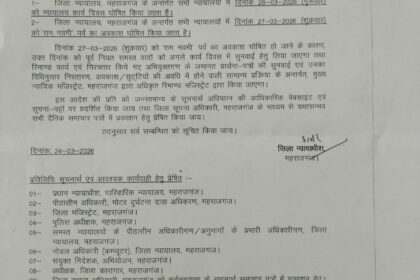 पूर्वांचल राज्य ब्यूरो महराजगंज /घुघली पल्टू मिश्रा जिला न्यायालय महराजगंज में राम नवमी पर्व के अवकाश को लेकर महत्वपूर्ण प्रशासनिक बदलाव किया गया है। जिला न्यायाधीश, महराजगंज द्वारा जारी प्रशासनिक आदे...