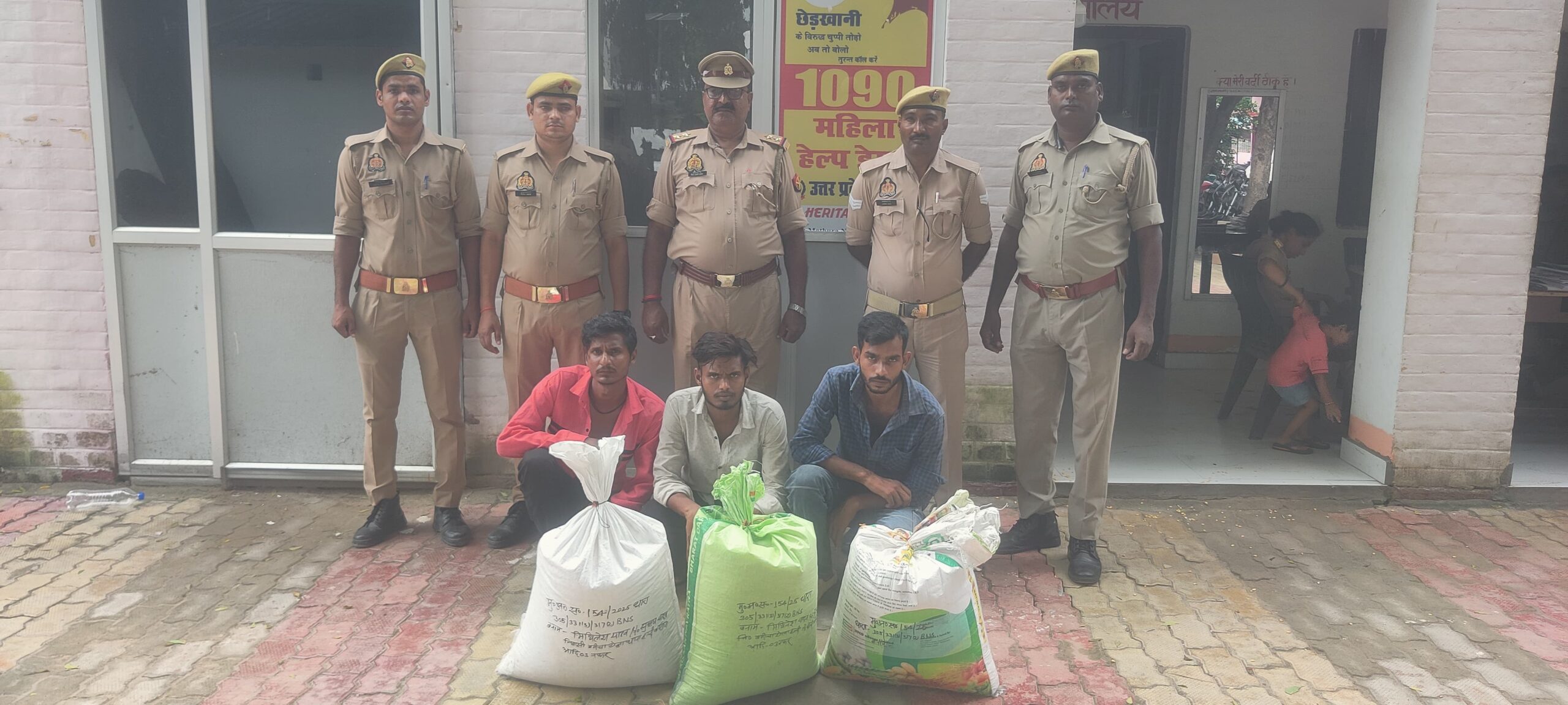 बलिया। पुलिस अधीक्षक ओमवीर सिंह के निर्देशन में अपराध एवं अपराधियों के खिलाफ चलाए जा रहे अभियान के तहत थानाध्यक्ष हल्दी रोहन राकेश सिंह के नेतृत्व में गुरुवार के दिन उपनिरीक्षक शिवप्रकाश पाठक अपने हमराह हेका कपिल सिंह, सिपाही दीपक गुप्ता, सिपाही विवेक यादव के साथ वाहन चेकिंग के दौरान हल्दी तिराहे के पास मौजूद थे कि मुखबिर से सूचना मिली की चोरी से सम्बन्धित 02 अभियुक्त व 01 अन्य व्यक्ति जो गोदामे से हुई चोरी के मक्के की बोरी के साथ निर्माणाधीन ग्रीन फील्ड एक्सप्रेस वे के पास खड़े होकर साधन का इंतजार कर रहे हैं। सूचना पर तत्काल पुलिस टीम मौके पर पहुंच कर तीनों को हिरासत में लिया गया। तीनों के पास से 3 बोरी मक्का बरामद किया गया। पकड़े गए अभियुक्तों में मिथिलेश यादव पुत्र सुभाष यादव निवासी ग्राम बगीचा टोला हल्दी थाना हल्दी उम्र करीब (22) वर्ष, छोटक गुप्ता उर्फ कुश गुप्ता पुत्र जितेन्द्र गुप्ता निवासी पश्चिम टोला हल्दी (21) वर्ष, तथा विशाल यादव पुत्र उमाशंकर यादव निवासी पश्चिम टोला हल्दी थाना हल्दी (35) वर्ष थे। गिरफ्तार अभियुक्तों के खिलाफ विधिक कार्यवाही करते हुए चालान न्यायालय किया गया।