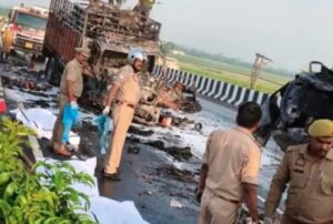 अलीगढ़ ;- अलीगढ़ में मंगलवार सुबह नेशनल हाईवे पर कार और मिनी बस में आमने-सामने की भिड़ंत हो गई। भिड़ंत के बाद आग लगने से एक ही परिवार के 5 लोग जिंदा जल गए हैं। एक व्यक्ति गंभीर रूप से घायल हो गया। घटना अलीगढ़ के थाना अकराबाद क्षेत्र के गोपी फ्लाईओवर के पास की है, जहां तेज रफ्तार की वजह से दोनों गाड़ियां आपस में भिड़ गईं। हादसे की सूचना मिलते ही एसपी देहात सहित दमकल की गाड़ियां मौके पर पहुंचीं। घायल व्यक्ति को अलीगढ़ के जिला अस्पताल में भर्ती कराया गया। उनकी हालत गंभीर बनी हुई है। पुलिस अधिकारियों ने बताया कि एटा की ओर से आ रही कार व मिनी बस में आमने-सामने की टक्कर की सूचना है। कार का टायर फटने से हादसा होने की सूचना है। इसकी जांच कराई जा रही है। उन्होंने बताया कि टक्कर इतनी तेज थी कि ईंधन टैंक फट गया, जिससे आग लग गई और हादसा हो गया। आग तेजी से फैल गई और गाड़ियों के अंदर फंसे लोगों को बाहर निकलने का मौका ही नहीं मिला, जिसकी वजह से पांच लोगों की मौत हो गई।