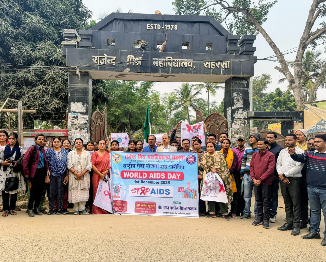 विश्व एड्स दिवस 2025 के मौके पर राजेन्द्र मिश्र महाविद्यालय, सहरसा में राष्ट्रीय सेवा योजना (NSS) के तत्वावधान में एक महत्वपूर्ण संगोष्ठी आयोजित की गई। इसके उपरांत प्राचार्य प्रो. (डॉ.) गुलरेज रौशन रहमान ने तिवारी टोला बायपास रोड पर जागरूकता रैली को हरी झंडी दिखाकर रवाना किया।