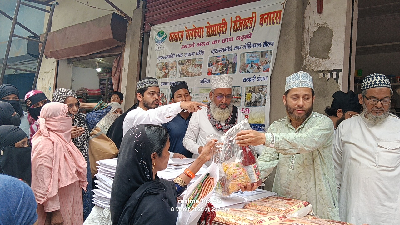 18 रमज़ान सन 1447 हिजरी परवाज़ वेलफेयर सोसाइटी बनारस की तरफ से मुस्लिम स्कूल लल्लापुरा गेट के बाहर ज़रूरतमंद हाजतमंद ख्वातीन को स्पेशल इफ्तार किट तक्सीम किया गया और साथ ही साथ मंथली राशन किट और कपड़े के साथ-साथ नकाब तक़्सीम किया गया