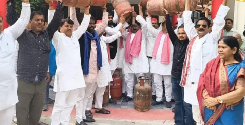 समाजवादी पार्टी गैस संकट पर हल्ला बोल सिलेंडर लेकर कलेक्ट्रेट पहुंचे कार्यकर्ता.