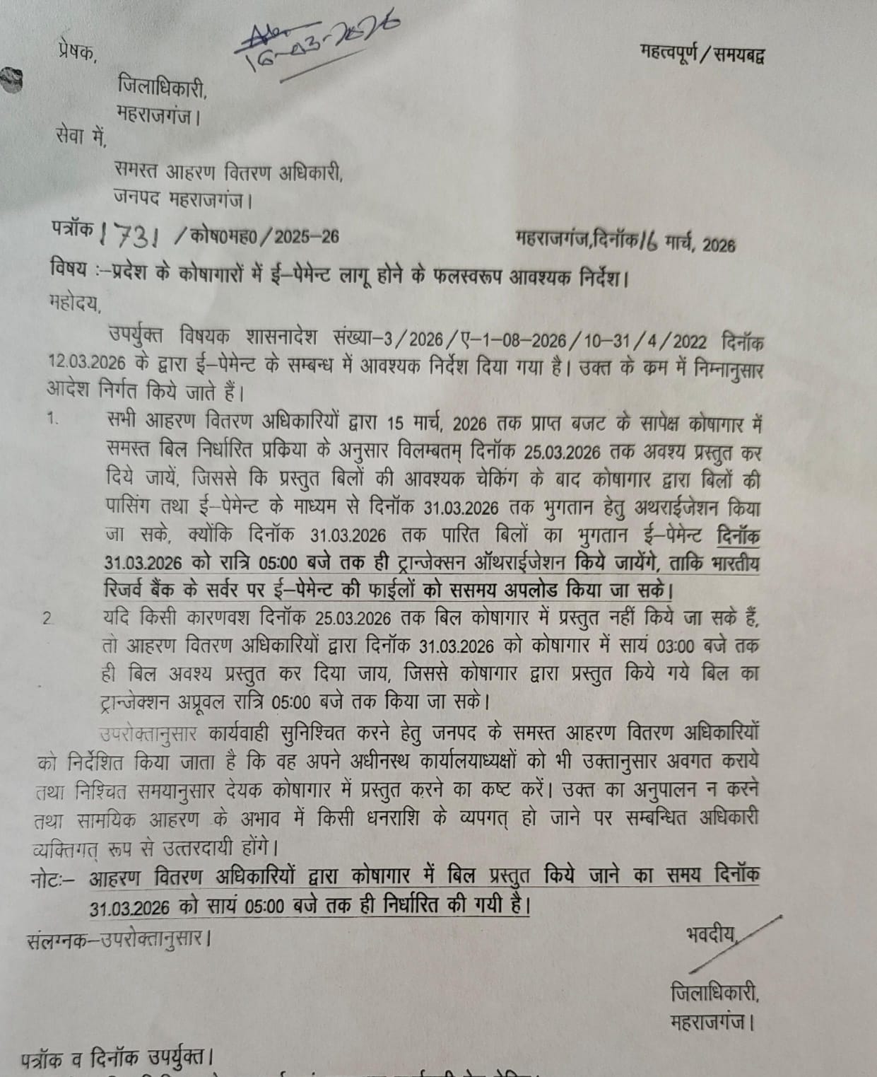 महराजगंज, 16 मार्च 2026। जिलाधिकारी ने जनपद के समस्त आहरण-वितरण अधिकारियों (डीडीओ) को निर्देशित किया है कि 15 मार्च 2026 तक प्राप्त बजट के सापेक्ष सभी बिल निर्धारित प्रक्रिया के अनुसार विलंबतम 25 मार्च 2026 तक कोषागार में अनिवार्य रूप से प्रस्तुत कर दिए जाएँ।