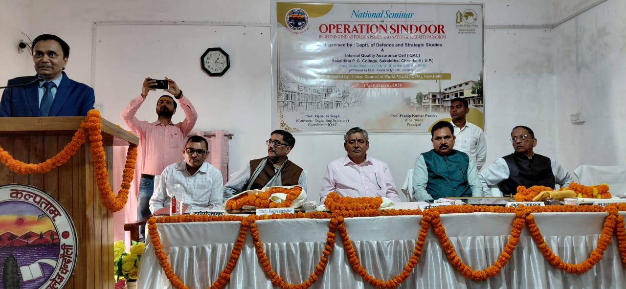 चन्दौली। सकलडीहा स्थित पीजी कॉलेज में मंगलवार को ‘ऑपरेशन सिंदूर’ विषय पर दो दिवसीय राष्ट्रीय संगोष्ठी का शुभारंभ हुआ। इस संगोष्ठी का आयोजन महाविद्यालय के रक्षा एवं स्ट्रैटेजिक अध्ययन विभाग तथा आंतरिक गुणवत्ता आश्वासन प्रकोष्ठ (IQAC) के संयुक्त तत्वावधान में किया गया, जिसे भारतीय वैश्विक परिषद का सहयोग प्राप्त था। कार्यक्रम में देश के विभिन्न विश्वविद्यालयों से आए विद्वानों, शिक्षकों एवं शोधार्थियों ने भाग लिया।