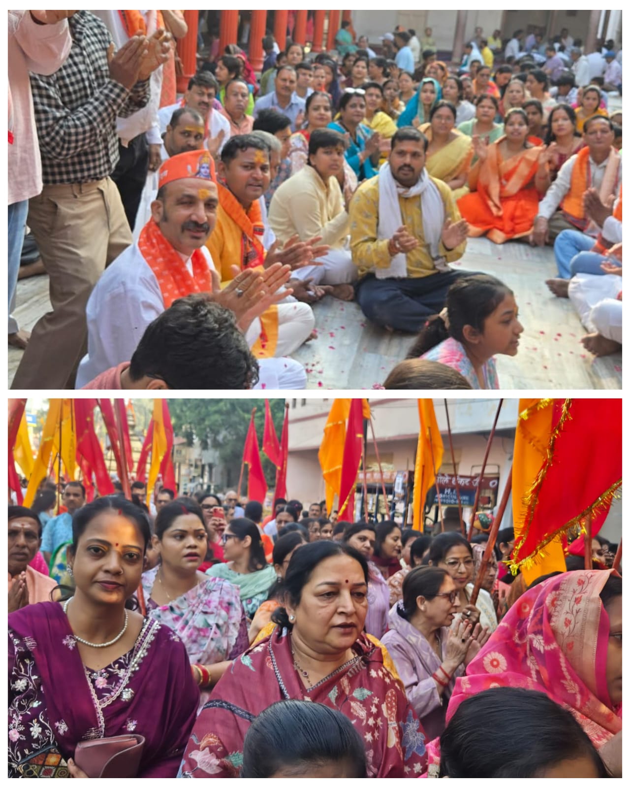 श्री हनुमान ध्वजा प्रभात फेरी समिति वाराणसी के तत्वाधान में 15 दिवसीय हनुमान ध्वजा प्रभात फेरी के आज ग्यारहवें दिन कार्यक्रम संयोजक यतींद्र कथूरिया जी ने आज के मुख्य अतिथि भरत लाडिया, प्रदीप तुलस्यान जी का दुपट्टा उड़ाकर समान किया। तत्पश्चात मुख्य अतिथि द्वारा हनुमान प्रभु जी की रथ पर विराजमान हनुमान प्रभु के विग्रह के समक्ष ज्योत प्रज्वलित करके हनुमान जी की आरती की गई। और सभी भक्तों में लाल ध्वजा लगभग 201 भक्तों में ध्वजा वितरण की गई एवं 61 महिला भक्तों को आरती की थाली प्रदान की गई।यह यात्रा गुरुधाम रविंद्रपुरी दुर्गाकुंड त्रिदेव मंदिर होते हुए श्री संकट मोचन मंदिर तक गयी। जहां श्री हनुमान जी के चरणों में सभी भक्तो द्वारा लाल ध्वजा अर्पित किया गया ।श्री संकट मोचन हनुमान जी के पावन मंदिर प्रांगण में भव्य सुंदरकांड पाठ का दिव्य आयोजन संपन्न हुआ। इस पावन अवसर पर संजय हजारी की सुमधुर वाणी में सुंदरकांड का भावपूर्ण वाचन हुआ, जिसमें हजारों श्रद्धालुओं ने उपस्थित होकर भक्ति रस का आनंद प्राप्त किया। पूरा वातावरण श्रीराम भक्ति में सराबोर हो उठा। तत्पश्चात मंदिर प्रांगण मे सामूहिक हनुमान चालीसा का पाठ व आरती हुई और सवामनी प्रसाद के रूप मे लड्डू,फल, ठंडई का वितरण हुआ । भव्य संगीतमय सुंदरकांड पाठ का संचालन श्री रघु देव अग्रवाल, सिद्धार्थ कपूर, विवेक शर्मा, प्रभात खेतान, अमित अग्रवाल, महेंद्र शर्मा द्वारा मंच का संचालन किया गया। श्री हनुमान जी का भव्य श्रृंगार टॉफी, चॉकलेट और सिक्के की माला से किया गया। साथी ही छप्पन भोग,ठंडई,लड्डू वह फल की सवामणि का भोग लगाया गया। अनूप केसरी, अमित शर्मा, सोहन अग्रवाल द्वारा मीठे मीठे भजनों की प्रस्तुति की गई। छम छम नाचे देखो वीर हनुमान, अंजनी को लाल निराला रे भजन पर भक्त मंत्र मुक्त हो गए। रवींद्रपुरी मोड़ पे श्री रितु शाह जी व मानस मंदिर के पास श्रीमती बेला जैन व निशांत जैन जी द्वारा श्री हनुमान जी की आरती कर भक्तों पर पुष्प वर्षा की। मारवाड़ी युवा फाउंडेशन अरिंदम शाखा द्वारा त्रिदेव मंदिर के सामने हनुमान जी की आरती कर सभी भक्तो में जल वितरण किया गया। इस सफल आयोजन हेतु श्री हनुमान ध्वज प्रभात फेरी समिति के सभी सदस्यों एवं उपस्थित सभी गणमान्य जनों व श्रद्धालुओं का हम हृदय से आभार एवं अभिनंदन करते हैं।