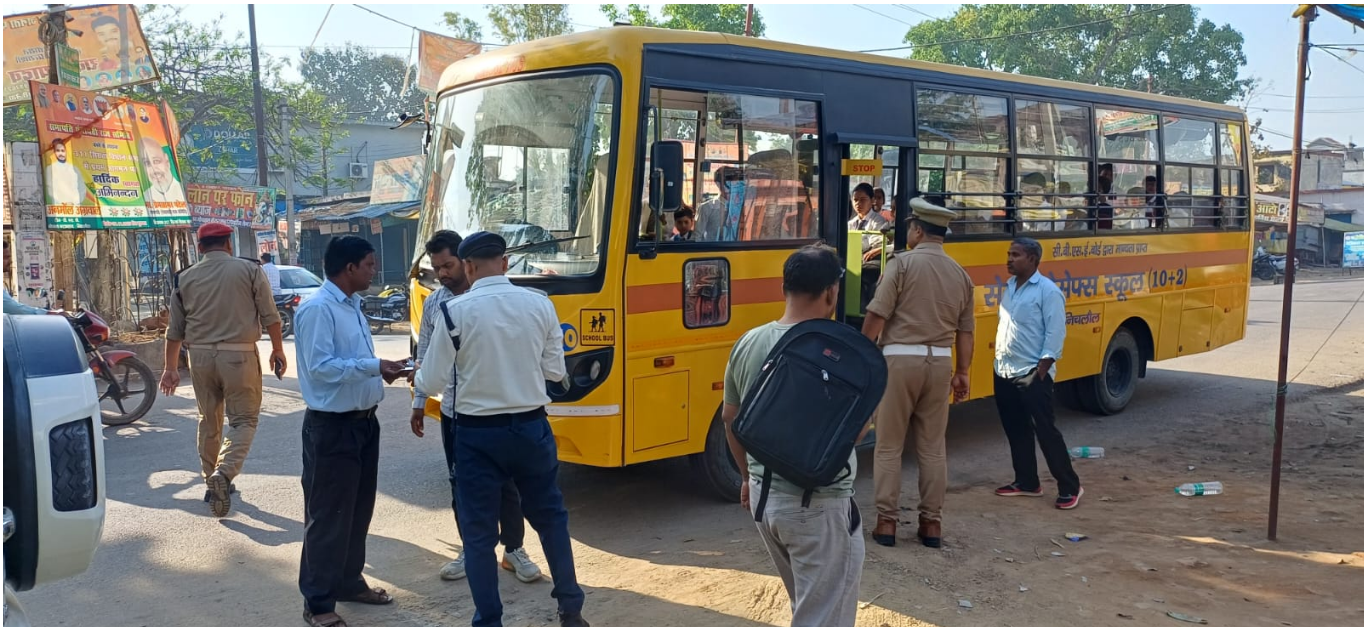 निचलौल में यातायात पुलिस का अभियान: स्कूली बसों की जांच, 9 वाहनों का चालान