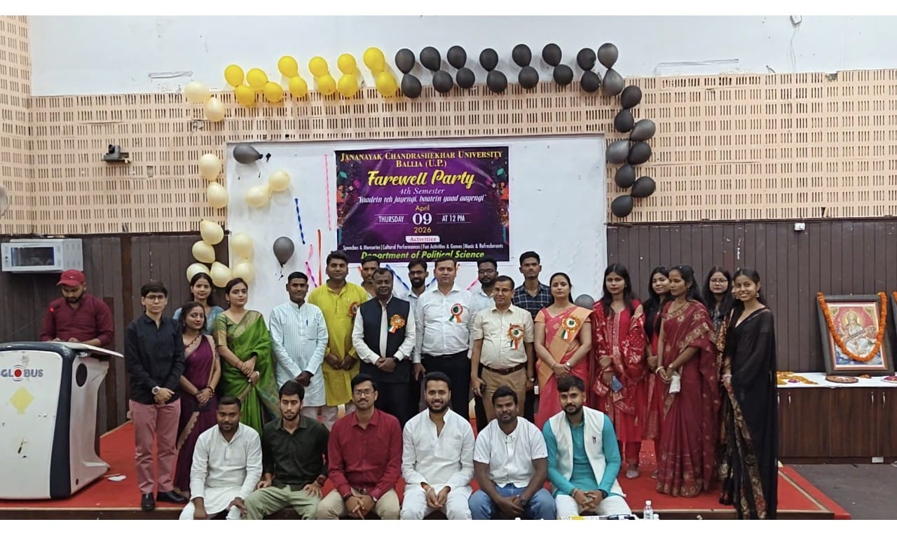 बलिया। जननायक चन्द्रशेखर विश्वविद्यालय परिसर स्थित जय प्रकाश नारायण सभागार में राजनीति विज्ञान विभाग के प्रथम वर्ष के छात्रों ने अन्तिम वर्ष के छात्रों के लिए विदाई समारोह कार्यक्रम आयोजित किया। कार्यक्रम की शुरुआत विश्वविद्यालय के कुलपति प्रो. संजीत कुमार गुप्ता और वित्त अधिकारी आनन्द दुबे ने दीप प्रज्वलित कर किया। इस अवसर कुलपति ने कहा कि यह प्रस्थान का समय नहीं है बल्कि छात्रों के लिए यह समय विश्वविद्यालय द्वारा अर्जित ज्ञान को समाज में वापस लौटाने के सुनहरे अवसर के समान है। कहा कि आपने, जो भी ज्ञान विश्वविद्यालय में रहकर अर्जित किया है, उस ज्ञान का उपयोग स्वयं को, समाज को और राष्ट्र को सशक्त और स्वस्थ बनाने में करें। कहा कि विश्वविद्यालय ऐसी धूरी है, जो नवसृजन का कार्य करती रहती है इसलिए सभी छात्रों से यही उम्मीद है कि वह अपने जीवन यात्रा के दौरान जिस मुकाम या स्थान पर रहे, अपने संस्थान का नाम रौशन करने का हरसंभव प्रयास कार्य करते रहें। कहा कि मजबूत लोकतंत्र ही मजबूत राष्ट्र की धुरी होती है, यदि हमें अपने राष्ट्र को मजबूत करना है तो विद्यार्थियों में राष्ट्र के प्रति समर्पण की भावना का सृजन करना होगा और यह जिम्मेदारी विश्वविद्यालय के शिक्षकों की है। छात्रों के मानसिक स्वास्थ्य और आध्यात्मिक विकास को ध्यान में रखकर ही विश्वविद्यालय में केशव ध्यान साधना केन्द्र स्थापित किया गया है, साथ ही परिसर में भारत के राष्ट्रीय प्रतीक अशोक स्तम्भ की प्रतिकृति को भी स्थापित किया गया है। कुलपति ने समस्त विद्यार्थियों को उनके उज्जवल भविष्य की कामना करते हुए उन्हें जीवन में सफल होने की बधाई दी।