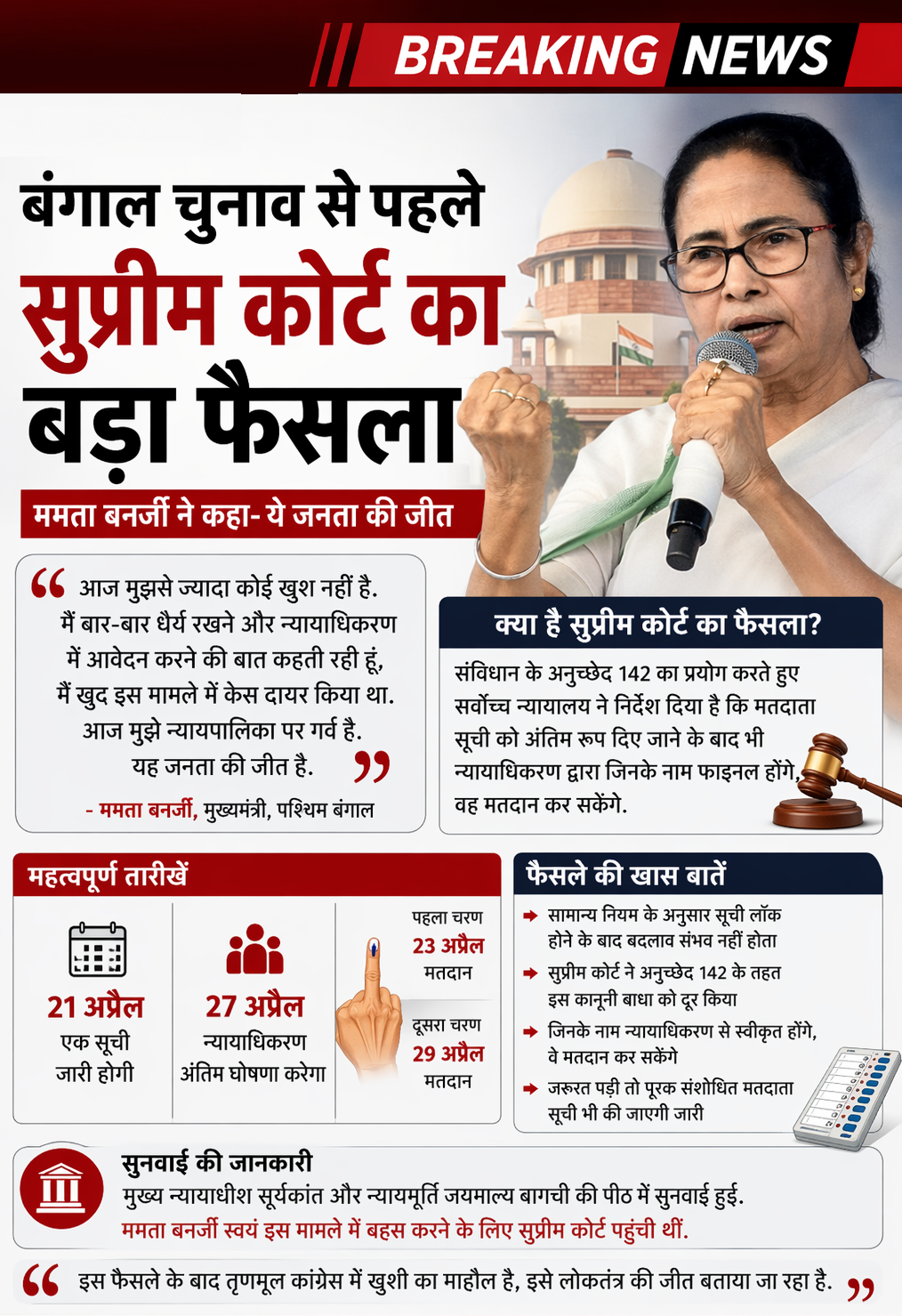 पश्चिम बंगाल विधानसभा चुनाव से ठीक पहले एक अहम संवैधानिक मोड़ सामने आया है। ममता बनर्जी ने शुक्रवार को सुप्रीम कोर्ट के फैसले पर खुशी जताते हुए इसे “जनता की जीत” बताया और न्यायपालिका पर गर्व व्यक्त किया।