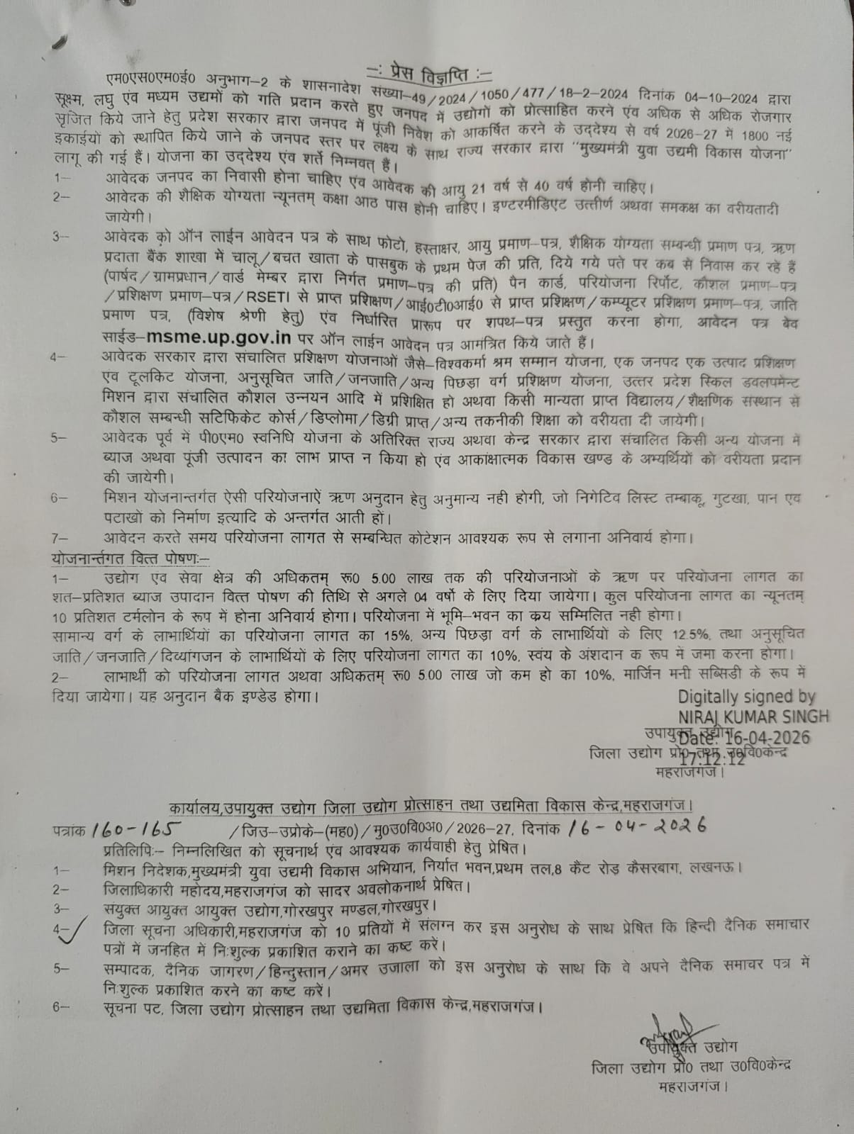 महराजगंज। जनपद में उद्योगों को बढ़ावा देने और अधिक से अधिक रोजगार सृजन के उद्देश्य से प्रदेश सरकार ने महत्वाकांक्षी “मुख्यमंत्री युवा उद्यमी विकास योजना” लागू कर दी है। शासनादेश संख्या-49/2024/1050/477/18-2-2024 दिनांक 04 अक्टूबर 2024 के तहत वर्ष 2026-27 में जनपद स्तर पर 1800 नई औद्योगिक इकाइयों की स्थापना का लक्ष्य निर्धारित किया गया है।