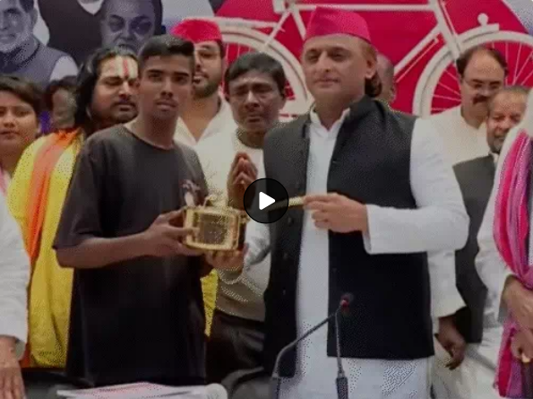 लखनऊ में पार्टी कार्यालय में आयोजित प्रेस कॉन्फ्रेंस के दौरान अखिलेश यादव ने चाय विक्रेता को बुलाया और उसे पीतल का भगोना भेंट किया।
