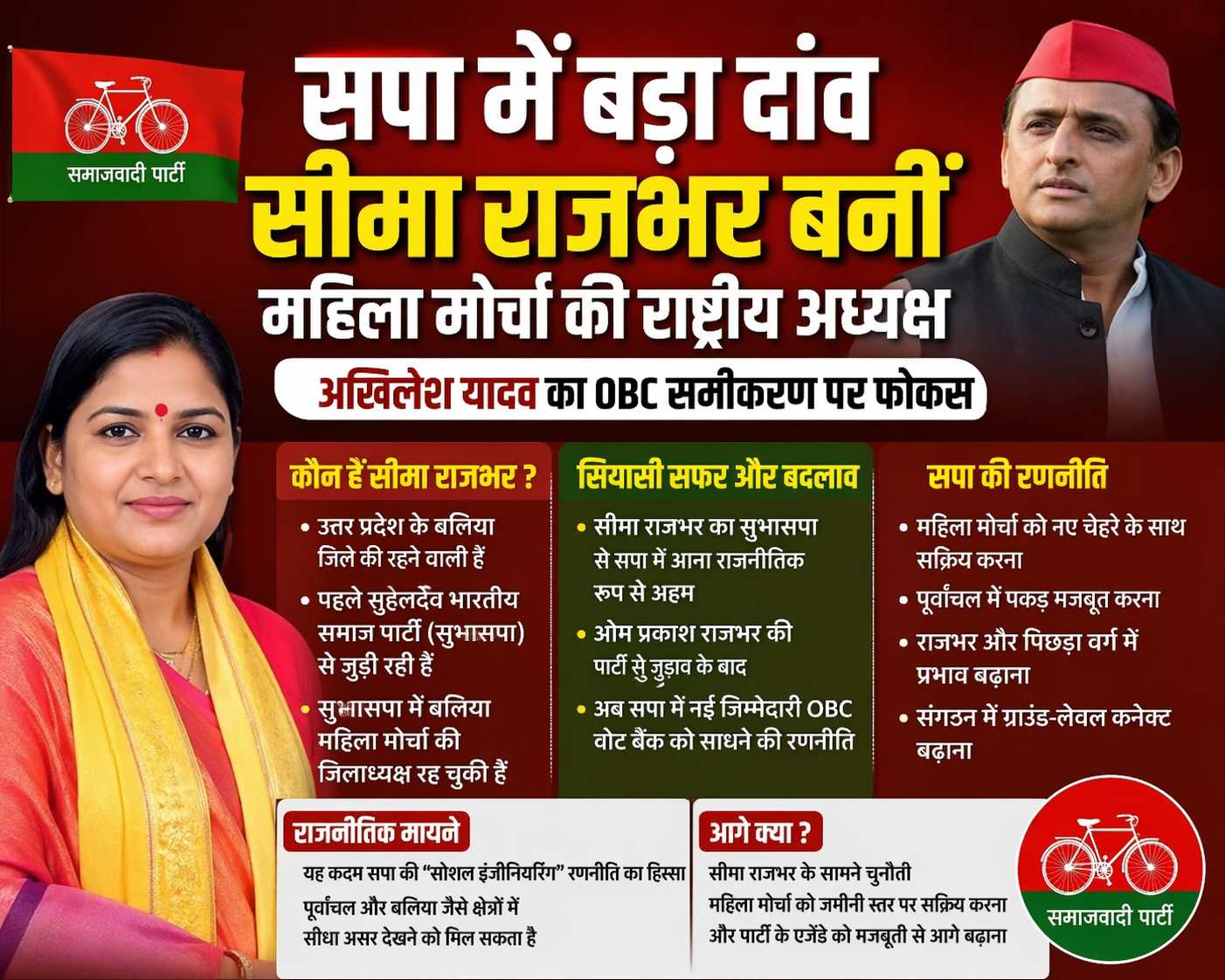 अखिलेश यादव ने संगठन को मजबूत करने की दिशा में बड़ा फैसला लेते हुए सीमा राजभर को समाजवादी पार्टी महिला मोर्चा का नया राष्ट्रीय अध्यक्ष नियुक्त किया है। यह नियुक्ति ऐसे समय में हुई है जब पार्टी 2027 के चुनावों को ध्यान में रखते हुए अपने सामाजिक समीकरणों को मजबूती देने में जुटी है।