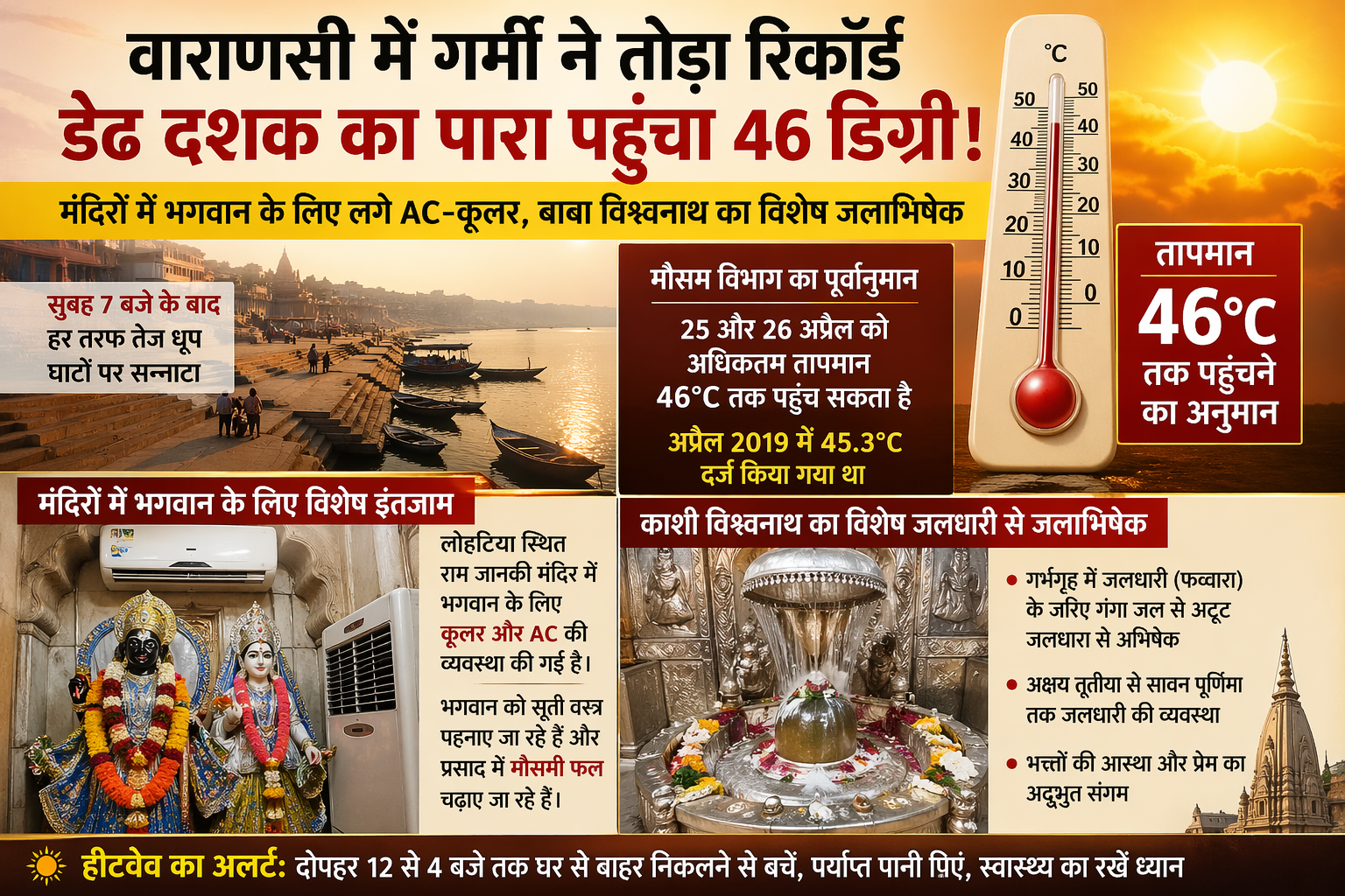वाराणसी में बढ़ती गर्मी ने जहां जनजीवन को प्रभावित किया है, वहीं धार्मिक परंपराओं में भी बदलाव देखने को मिल रहा है। मंदिरों में भगवान के लिए विशेष इंतजाम आस्था और बदलते मौसम दोनों की झलक पेश कर रहे हैं।